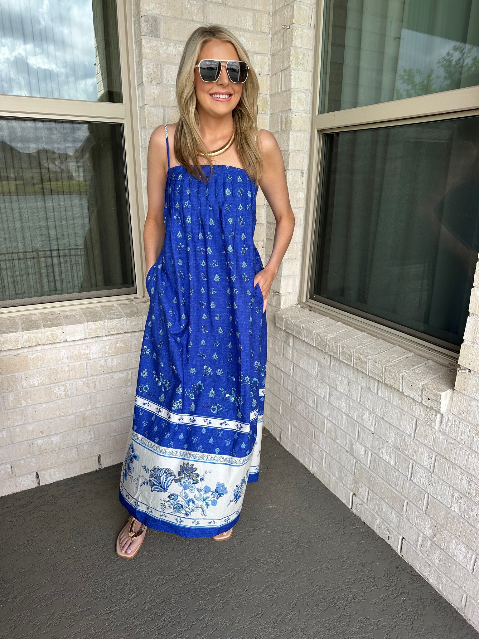 Effortless elegance meets everyday comfort in the Blueblood Beauty Dress. Crafted in a stunning royal blue with an eye-catching floral print, this versatile piece transitions seamlessly from spring into summer. The adjustable straps offer styling flexibility—wear them up for classic support or slip them down for a chic strapless look. A pleated relaxed fit skims the body without clinging, while functional side pockets keep your essentials close. Perfect for brunches, garden parties, or casual weekend outings, this dress is your go-to for laid-back style that never compromises on polish.