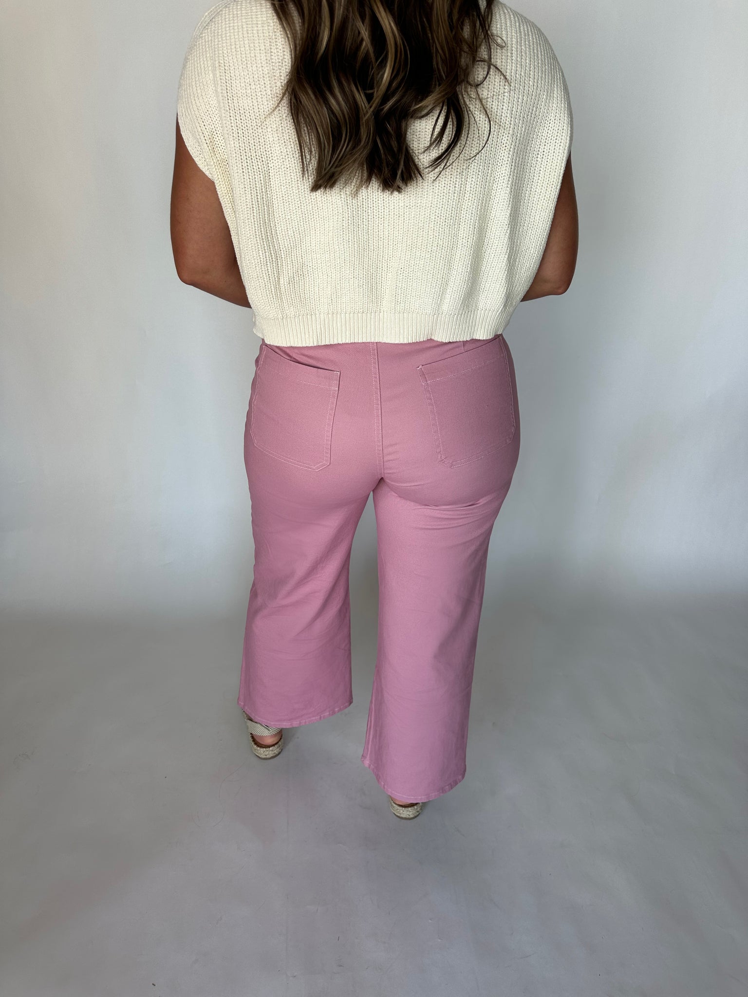 These Blush Rush Pants bring a playful pop of pink with bold exposed stitch details that highlight their unique design. Featuring patch pockets at both front and back, they combine style with handy functionality. The solid high waist with button fly and front zipper closure ensures a flattering fit that stays put while you move through your day with confidence and fun. Perfect for adding a fresh twist to your wardrobe!