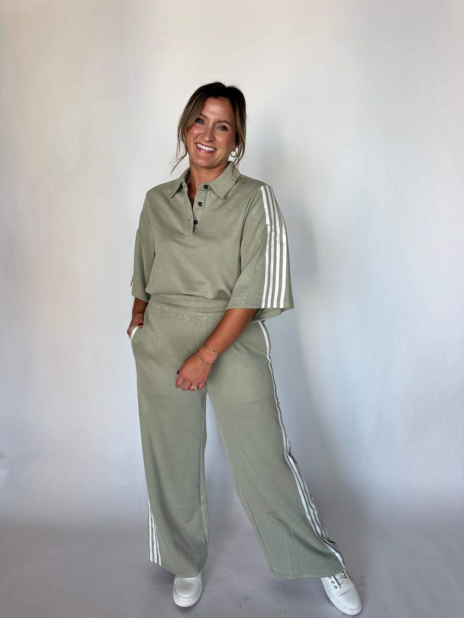 Slip into the playful comfort of Game On Bottoms in soothing sage green. These sweatpants feature a cozy elastic waist and handy side pockets for all your essentials. Stylish stripe trim accents the sides, while front pintuck details add a fun, flattering touch. Perfect for lounging or leveling up your casual look with ease.