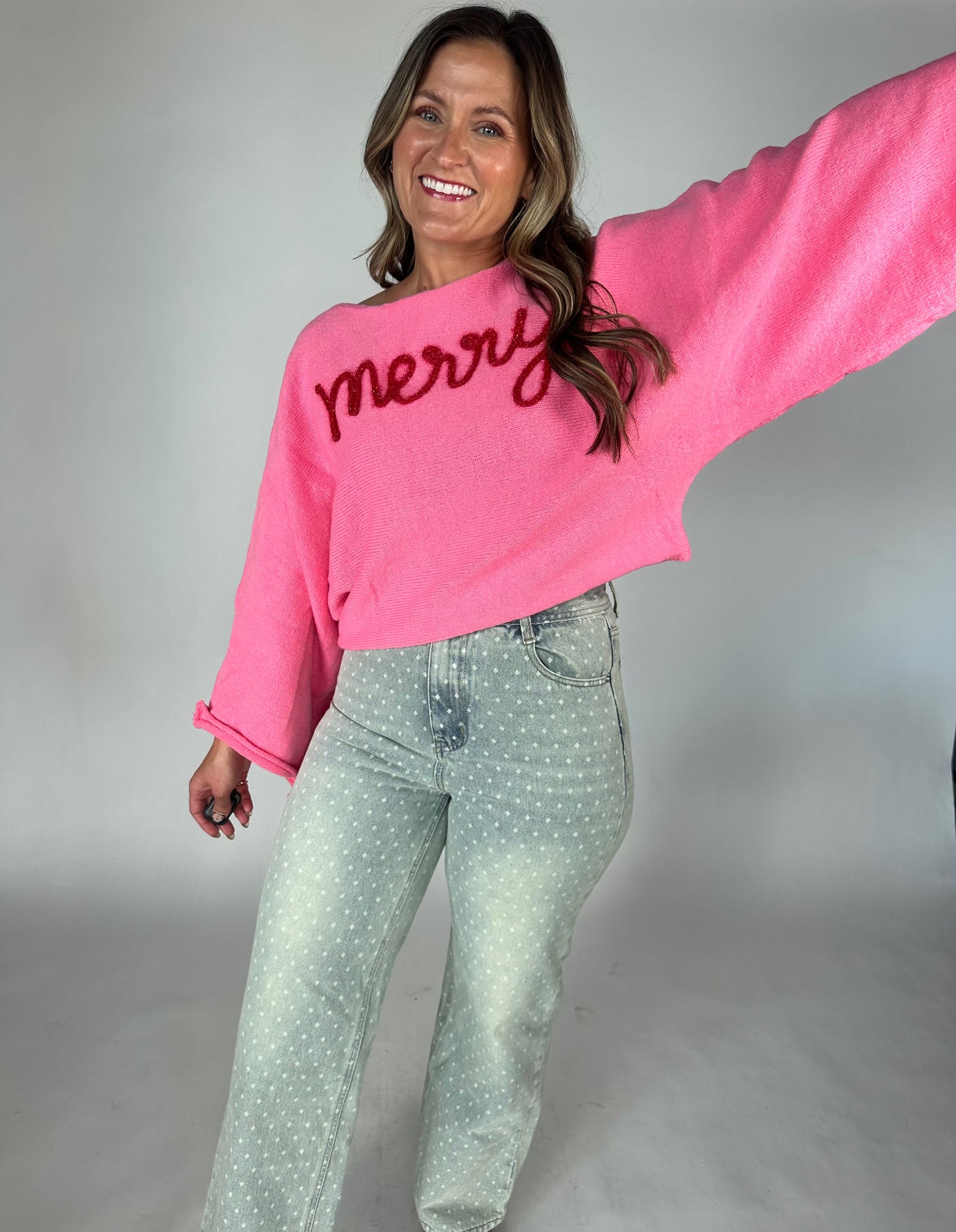 Spread holiday cheer in this playful pink crop sweater featuring bold red "Merry" tinsel lettering that catches the light. The roomy fit keeps you comfortable and stylish, while the lightweight fabric makes it perfect for layering or wearing solo. Whether you're heading to a festive gathering or just want to add some seasonal sparkle to your everyday look, this top brings the fun without the fuss.