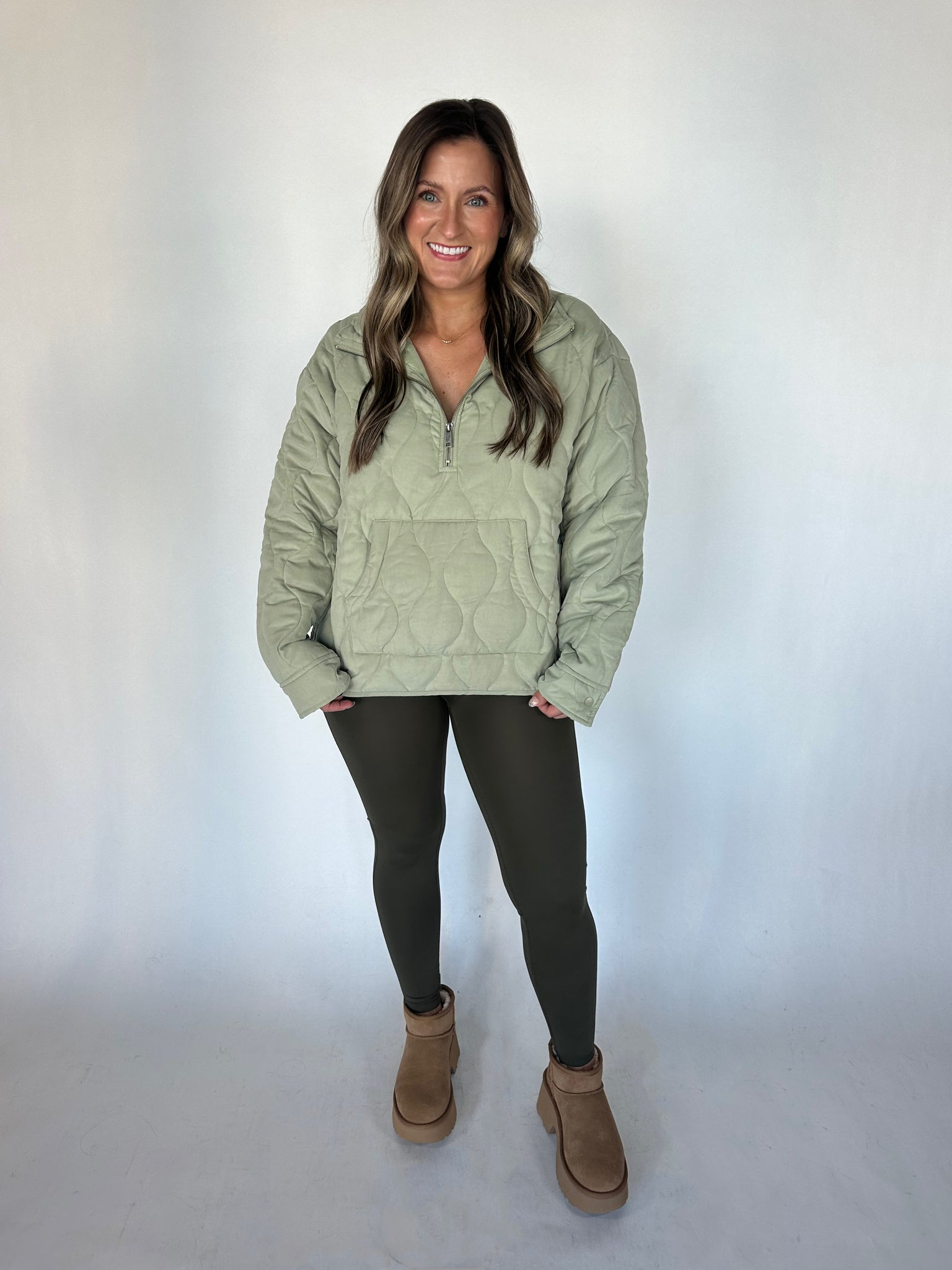 Wrap yourself in effortless comfort with the Sage Staple Pullover—your new go-to layer for everything from lazy mornings to casual outings. This quilted half-zip features a relaxed fit that moves with you, plus a handy front pocket for your essentials. The soft, cozy fabric feels like a warm hug, while the sage green hue pairs perfectly with any wardrobe. Simple, stylish, and undeniably comfortable.