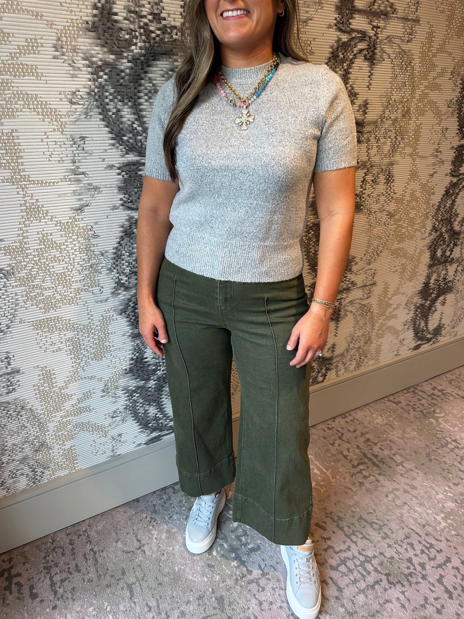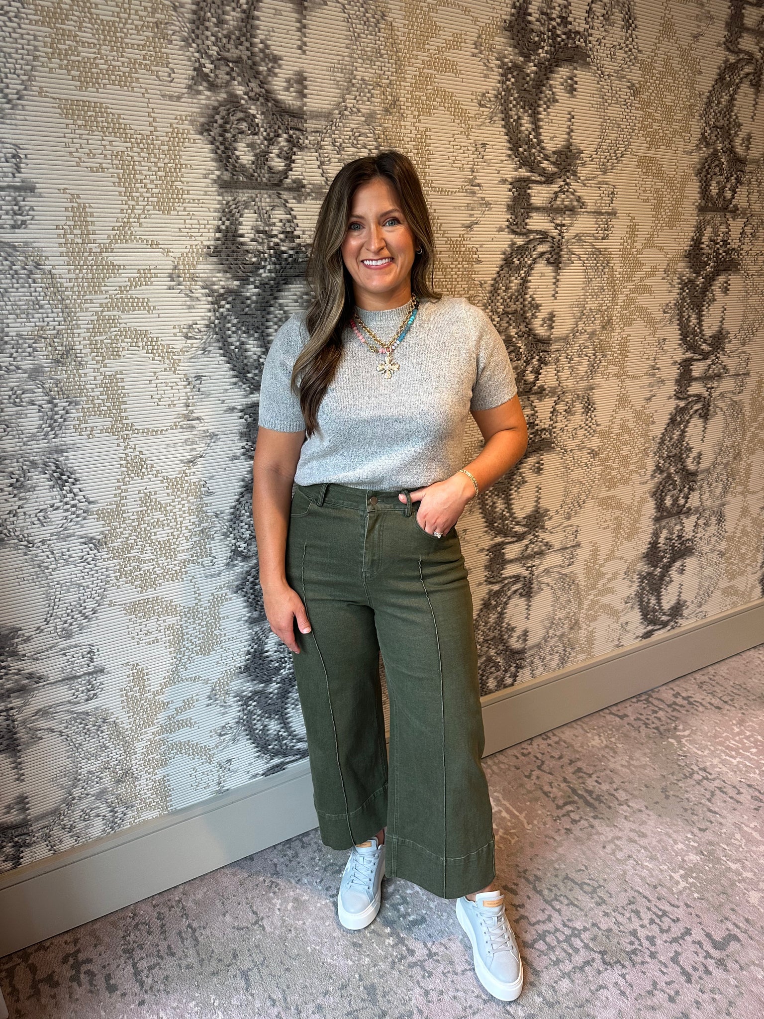 The Smoke & Mirrors Top in heather gray brings cozy vibes with a playful twist. This short sleeve knit sweater features a classic crew neck and soft, comfortable fabric that feels like a gentle hug. Finished with ribbed hems and sleeves, it’s the perfect mix of casual cool and style-smart fun.