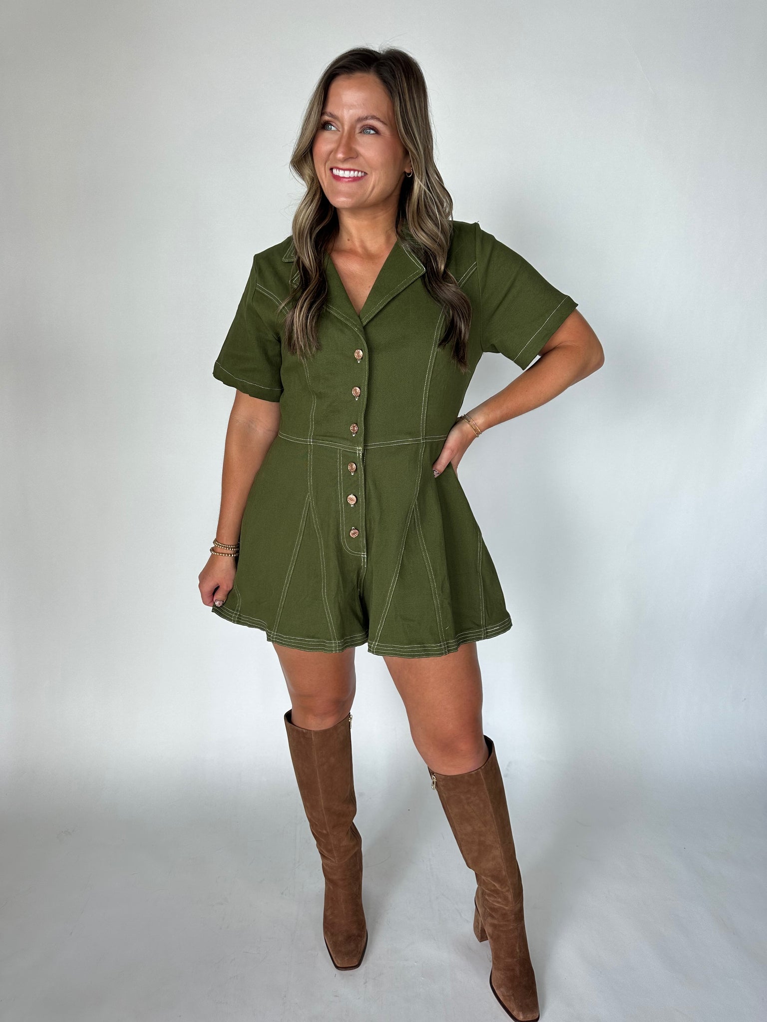The Sweet Fern Romper brings effortless charm to your wardrobe with its rich olive hue and relaxed button-up silhouette. Intricate stitching details dance across the fabric, adding texture and visual interest to every angle. Perfect for casual outings or dressed-up adventures, this playful piece transitions seamlessly from day to night. Slip it on and let your fearless style shine through.