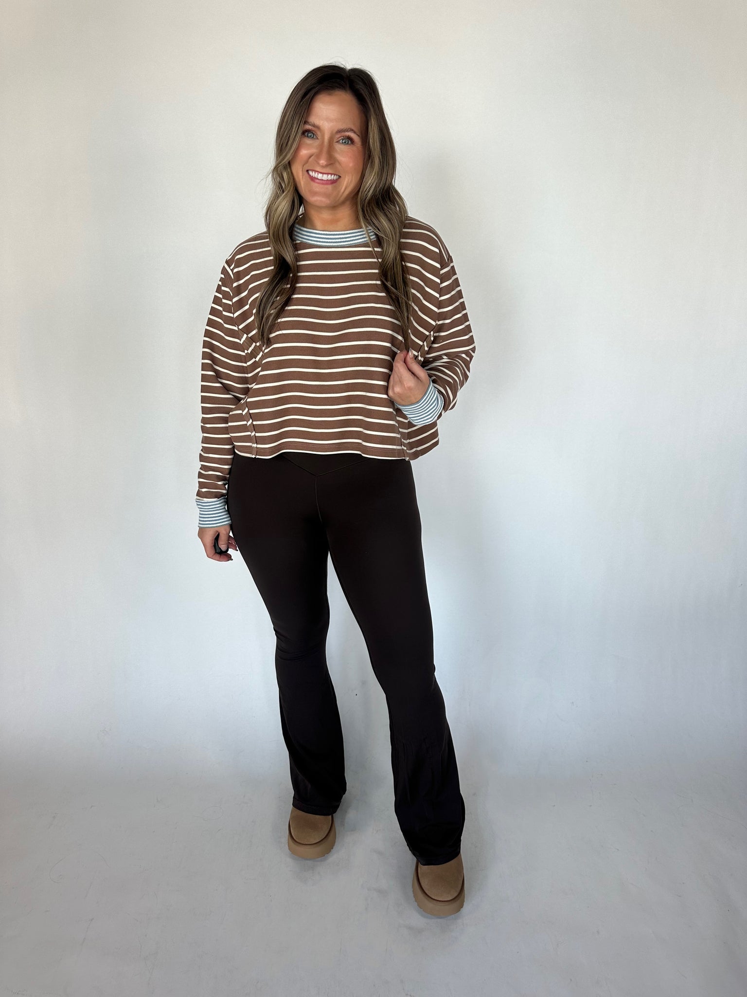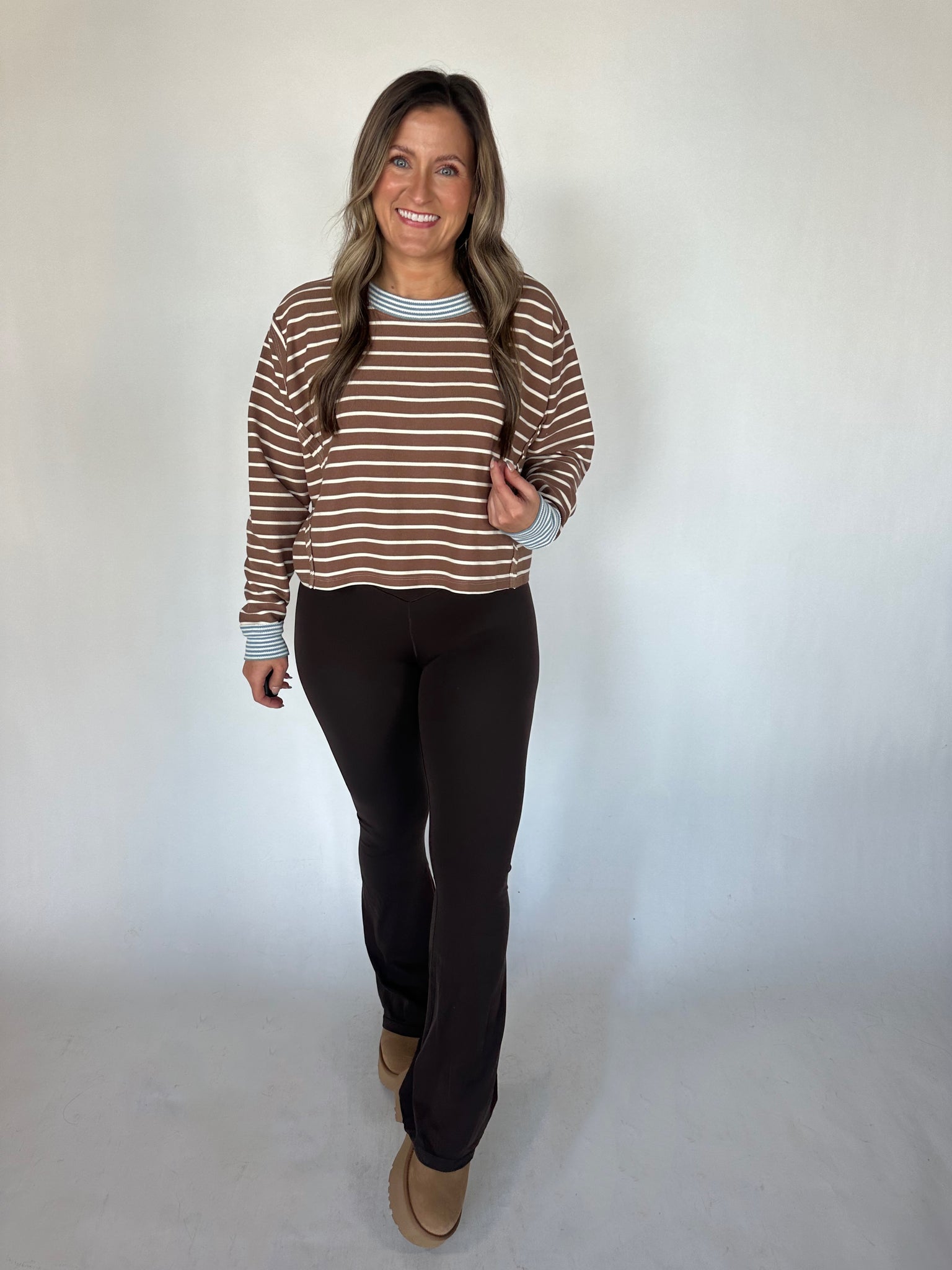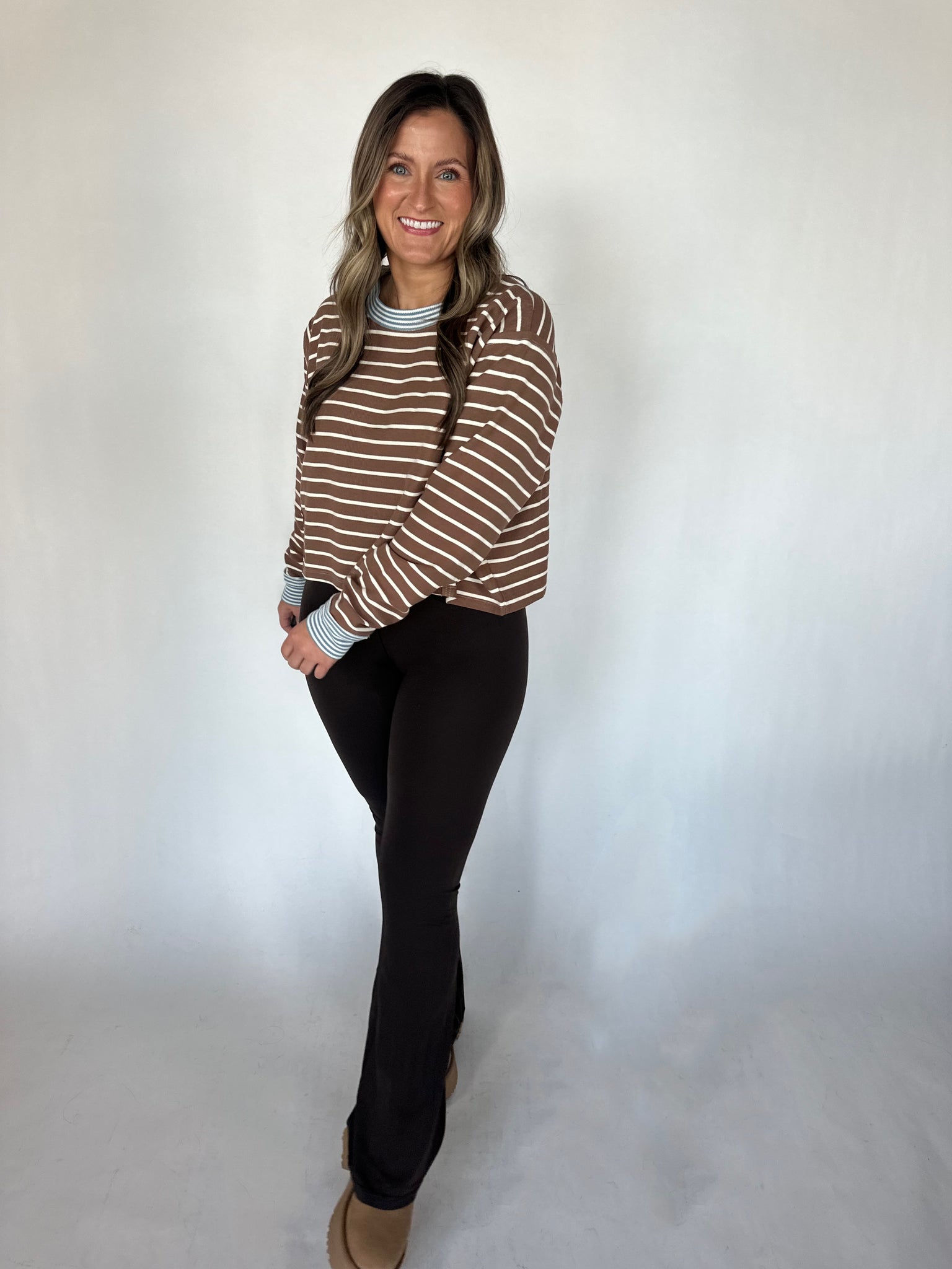Effortlessly chic and oh-so-cozy, this mocha stripe cropped long sleeve top is your new go-to layer. The relaxed fit makes it perfect for throwing on over your favorite tee or pairing with high-waisted bottoms for an instant style upgrade. Comfortable enough for all-day wear, this versatile piece transitions seamlessly from casual coffee runs to weekend hangouts. Simple, comfortable, and always in style.