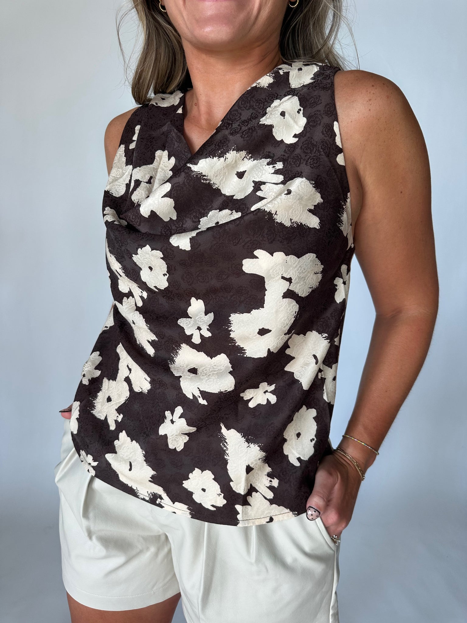 The Mocha Bloom Top is your go-to piece for effortless style. This sleeveless wonder features a beautifully draped neckline that adds movement and dimension to any outfit. Crafted from 100% polyester, it's easy to care for and perfect for layering or wearing solo. Whether you're dressing up for a night out or keeping it casual, this rich brown top brings warmth and sophistication to your wardrobe with a touch of playful flair.
