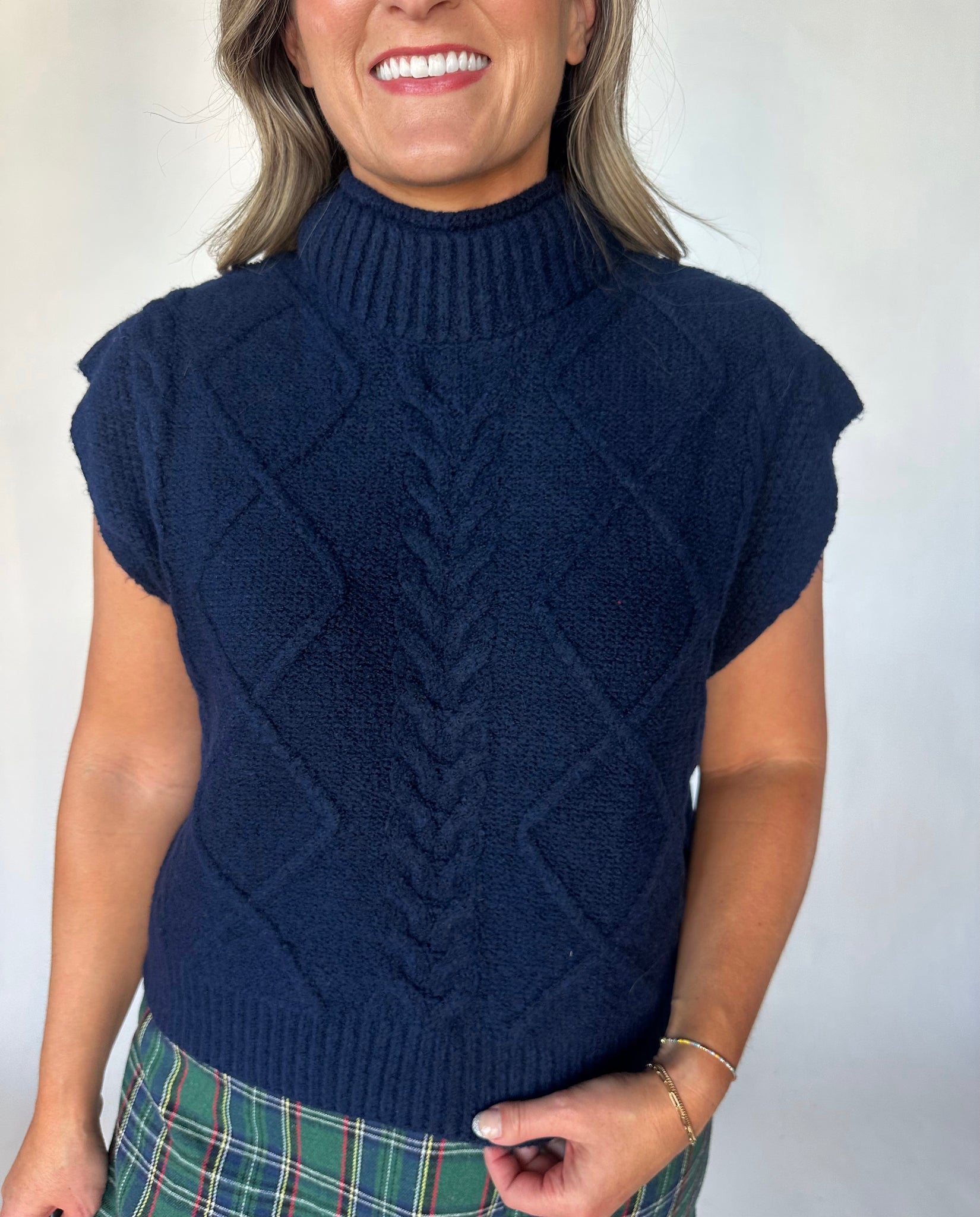 Meet your new go-to layer. This navy sleeveless sweater features a mock neck and textured corded detail that adds just enough visual interest to keep things fun. Slip it on over a long-sleeve shirt or rock it solo—either way, you've got comfort and style locked down. Playful, practical, and ready for whatever your day throws at you.